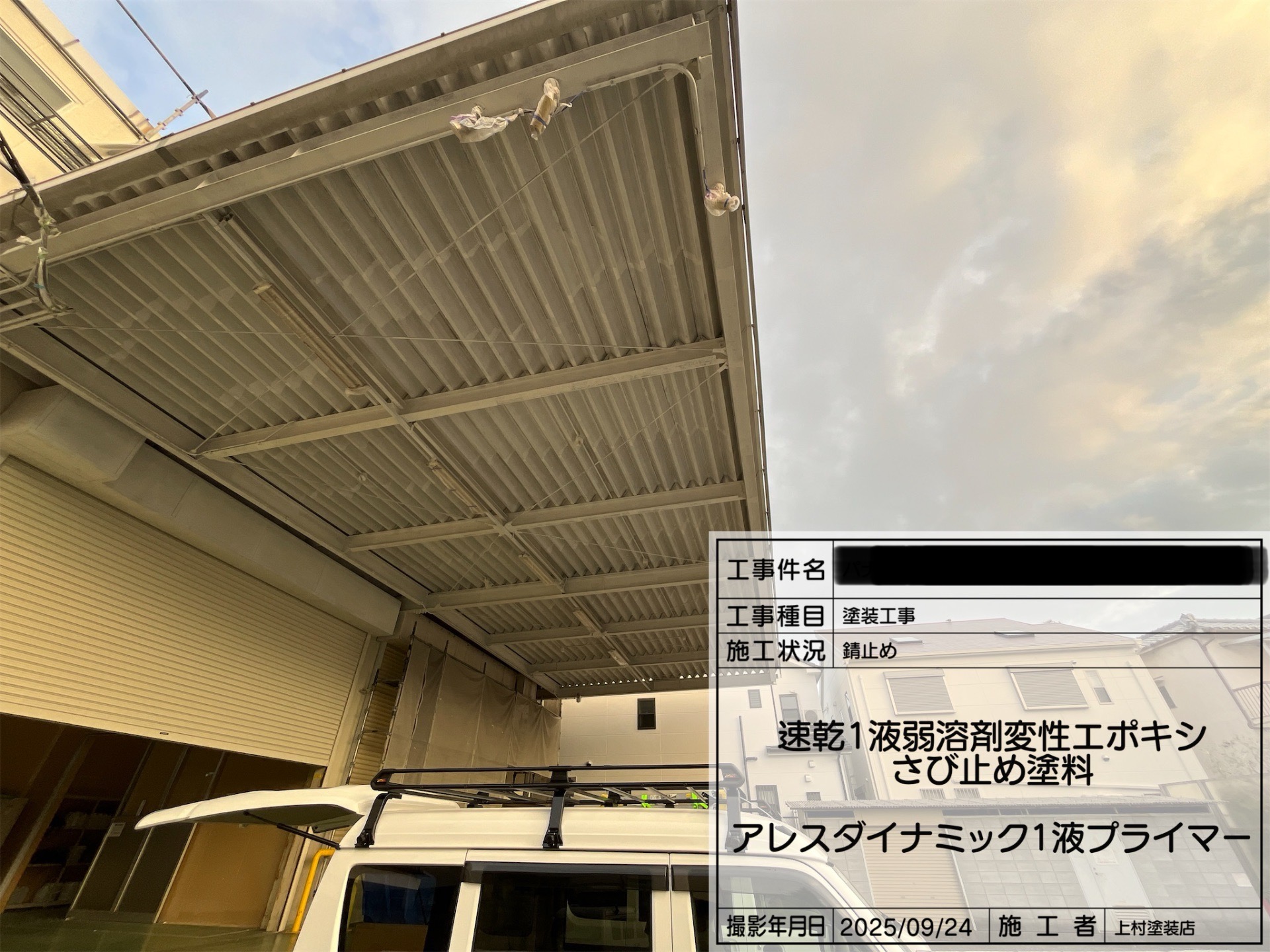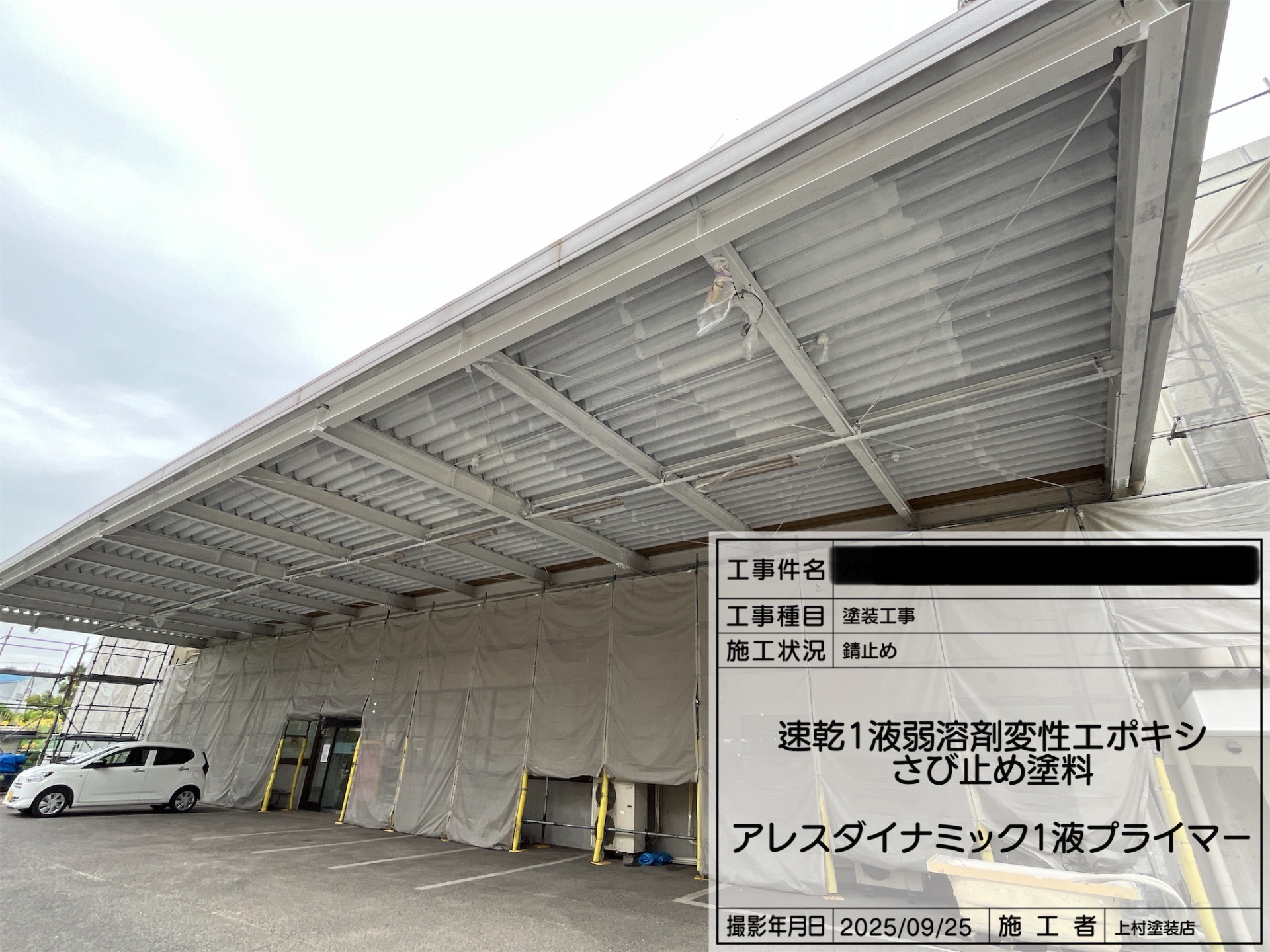 高石市 某SS塗装工事 2025.09.25 本日でようやく庇裏、鉄骨の 下塗り(錆止め)が終了しました。 明日から庇裏の吹き付けを行います🙇♂️ Tweet ブログ一覧, 上村日記 高石市 某SS塗装工事 高石市 某SS塗装工事